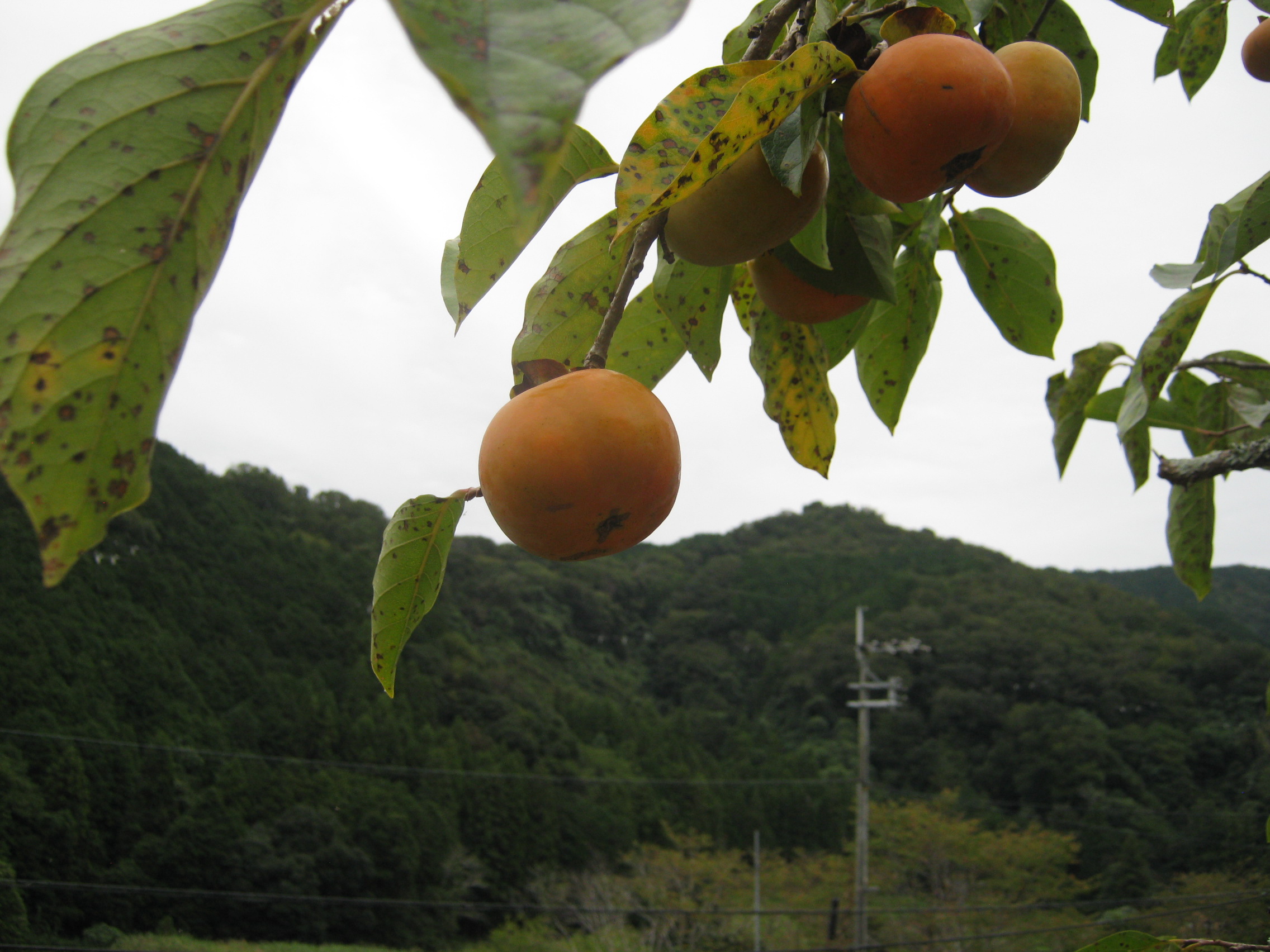 一本の木に甘柿と渋柿がなります。甘柿は果肉に黒い点々があります。渋柿は熟柿(じゅくし)にしたり、アルコール(焼酎)で渋抜きしたりします。