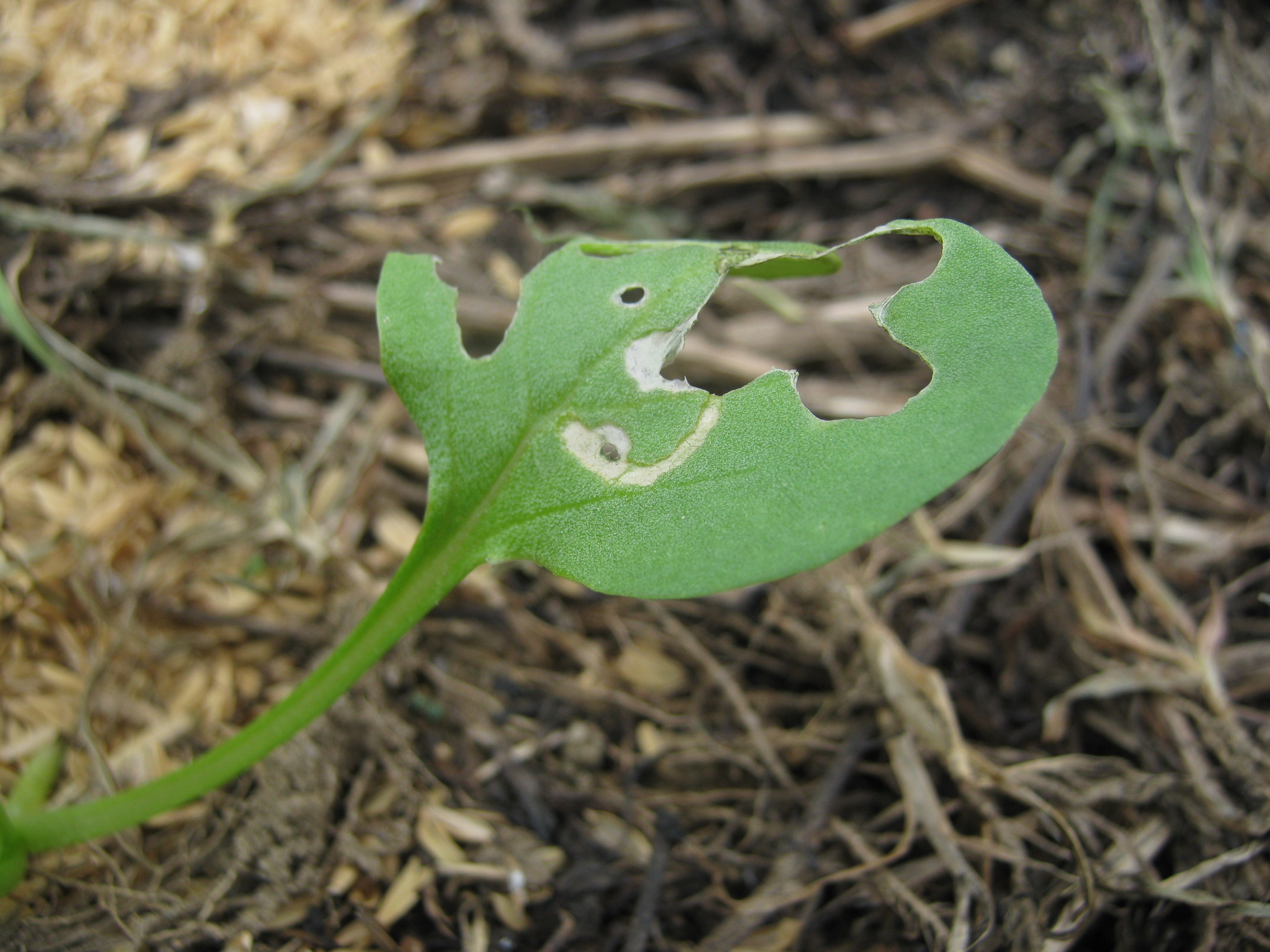 ヨトウムシか何か夜蛾っぽい幼虫が隠れています。