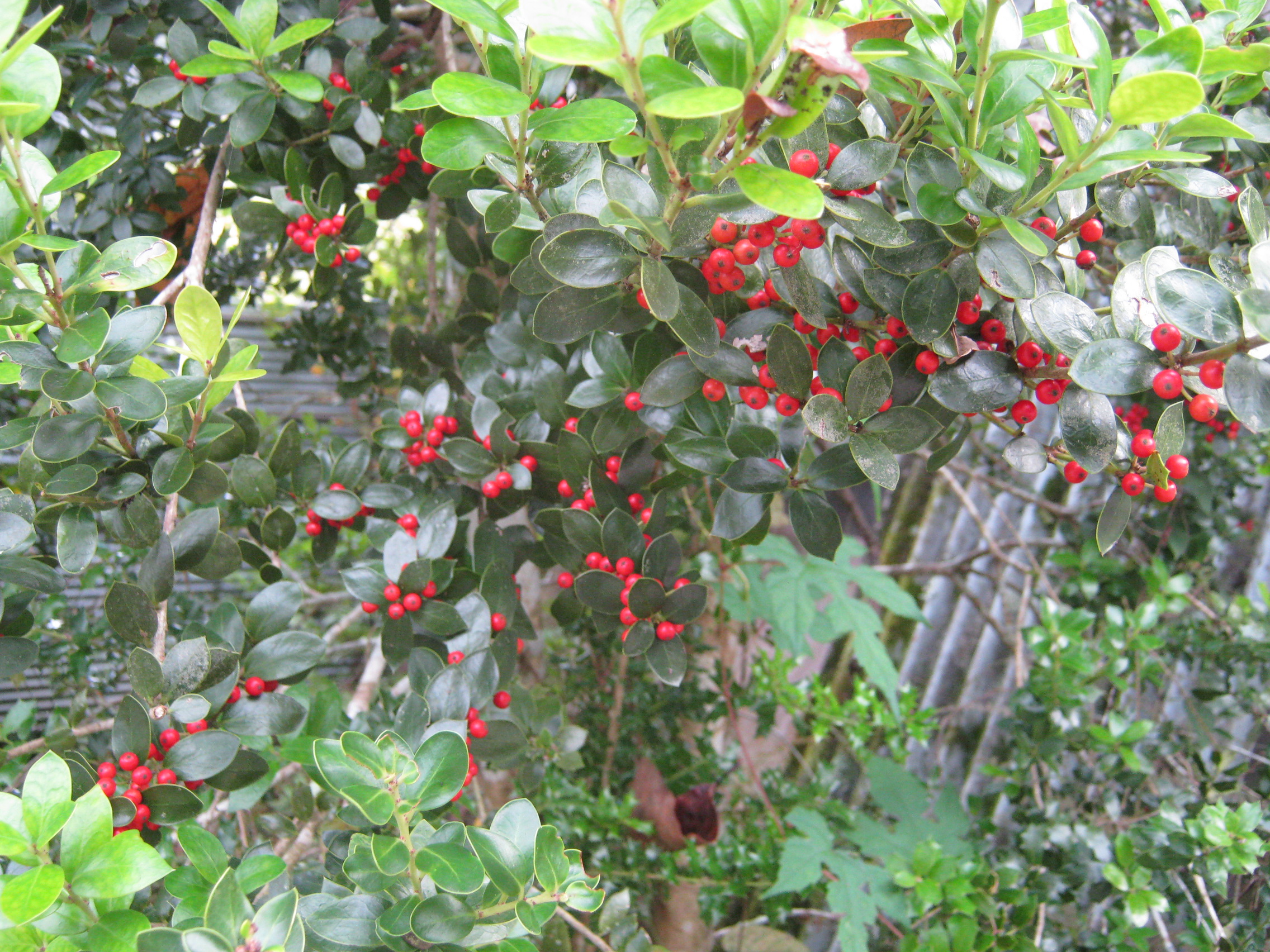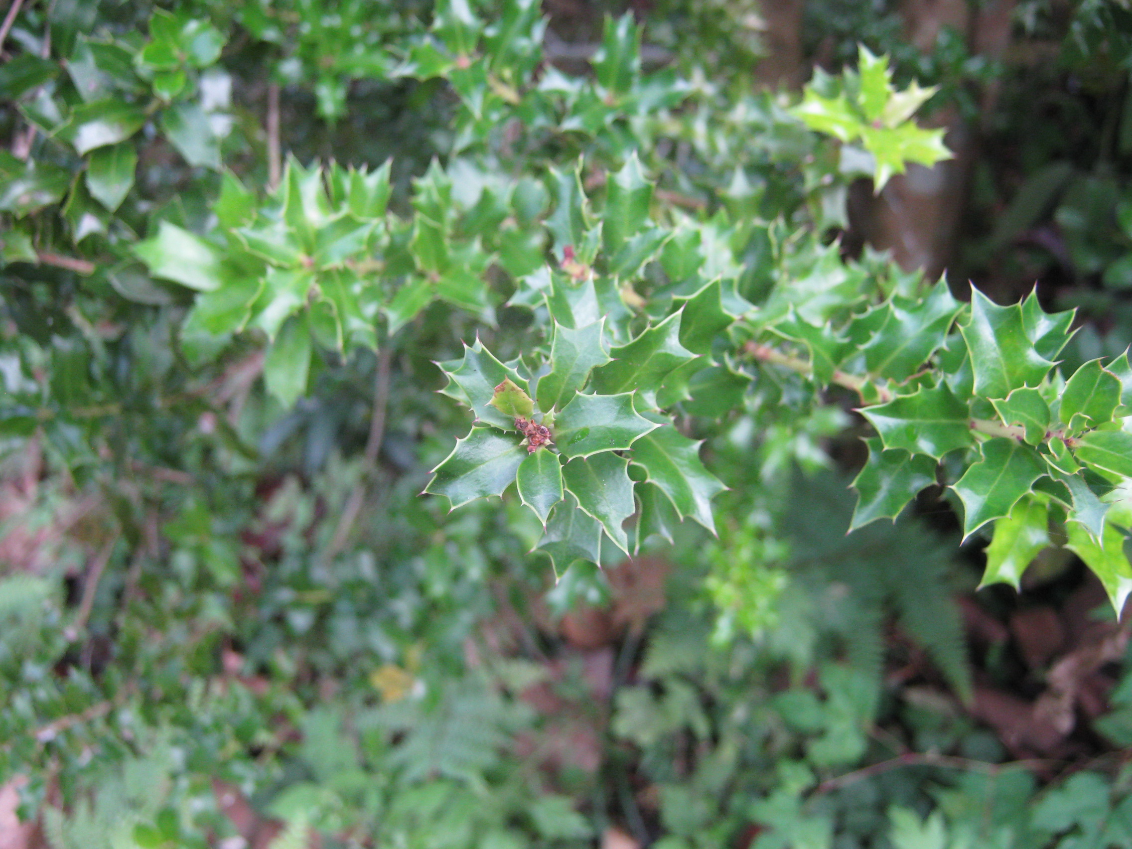 実をつけている枝はあまりヒイラギらしくありませんが、下の方の葉はヒイラギです。