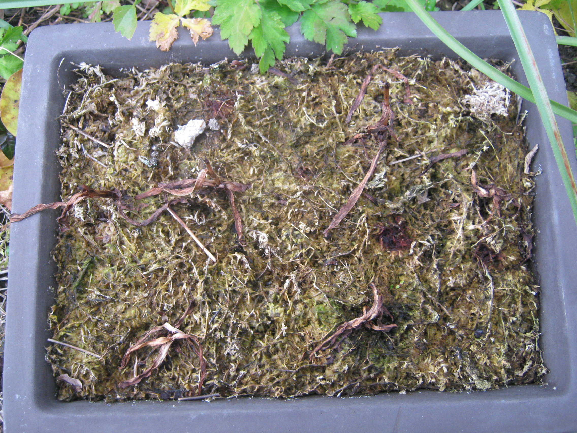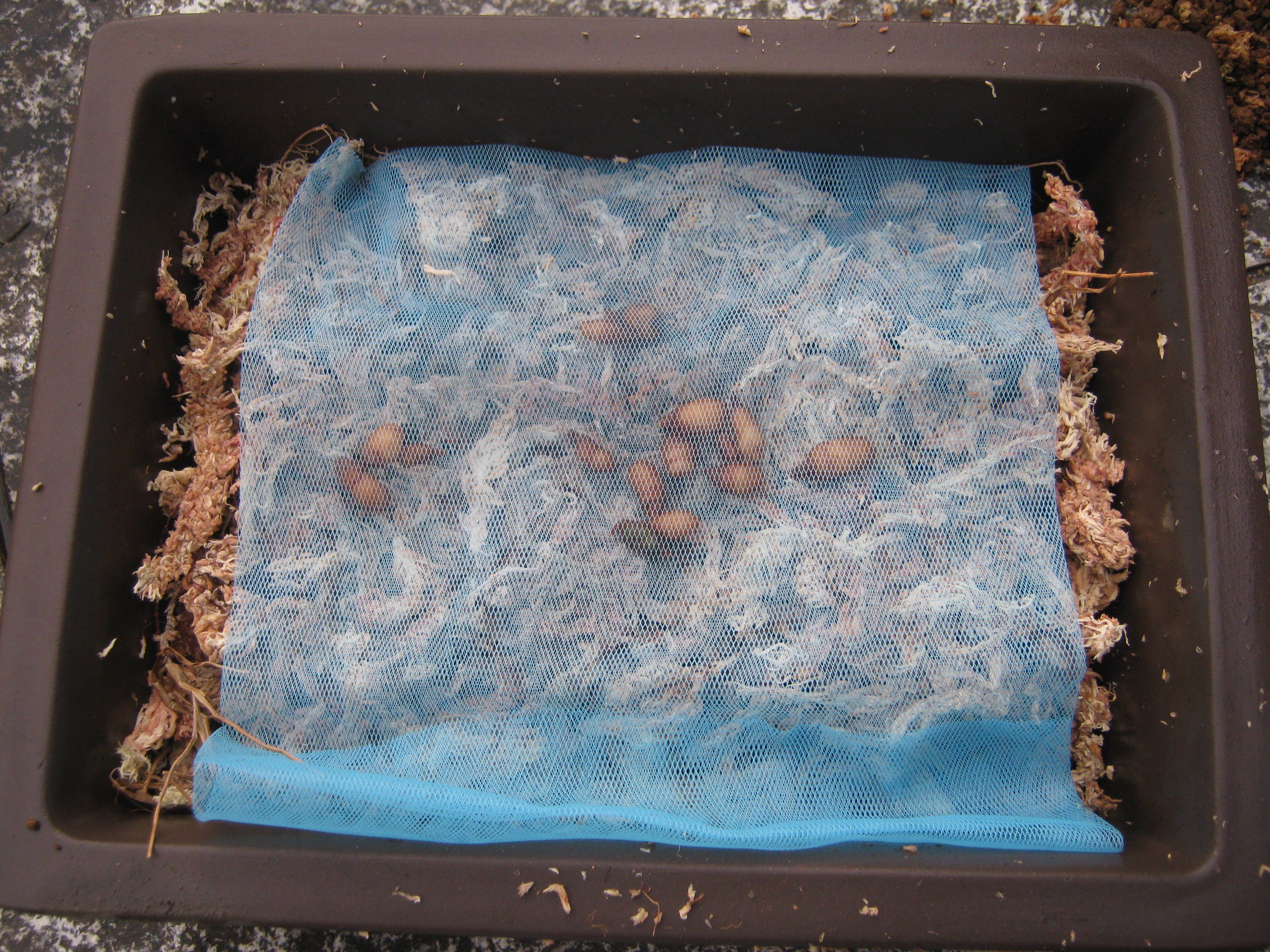 新しい水苔に変えてそのまま埋めようとしましたが、行方不明になりそうなので水切りネットに入れました。