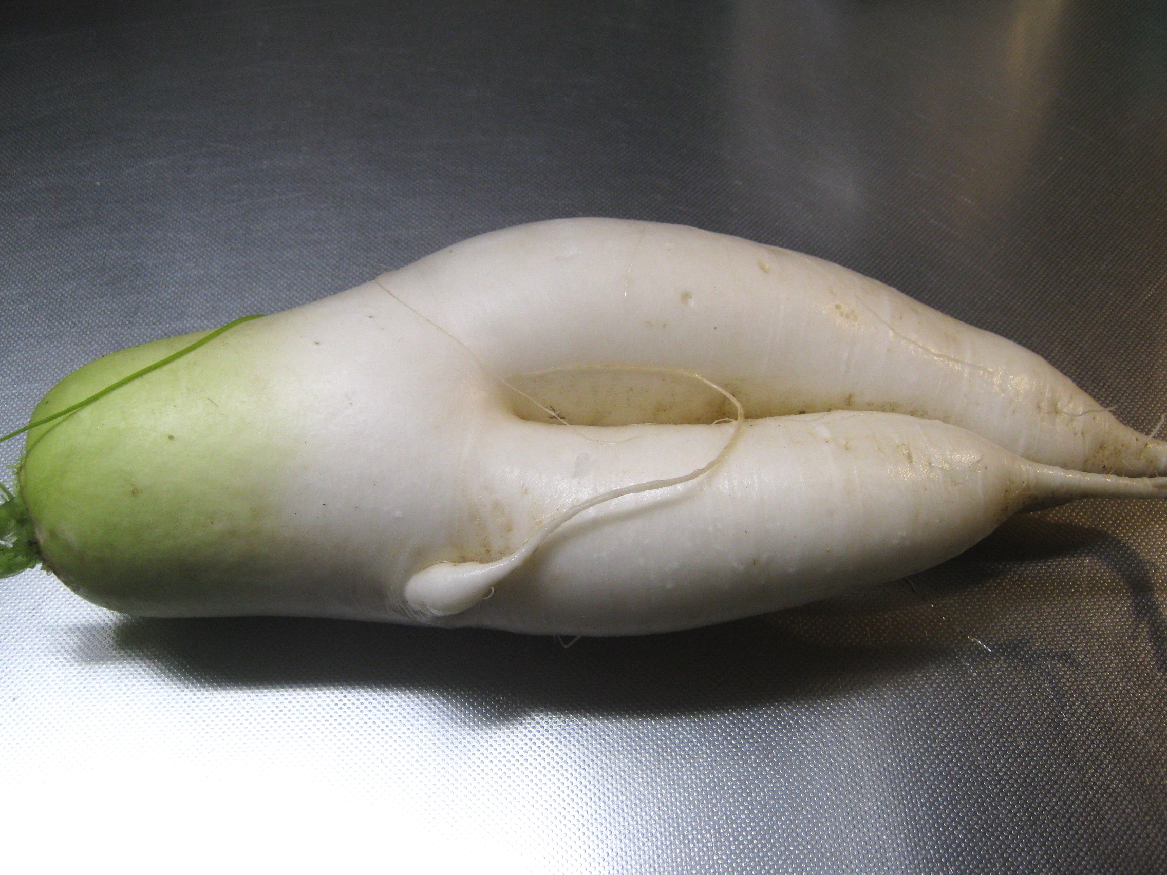 2025/12/27(土)二股大根 野菜::ダイコン 今夜もおでん。 地上部が短い大根を選んだら、二股に分かれていました。 5本目にして初めてです。 分かれた部分は、おでんにはちょうどいいサイズかも(笑)