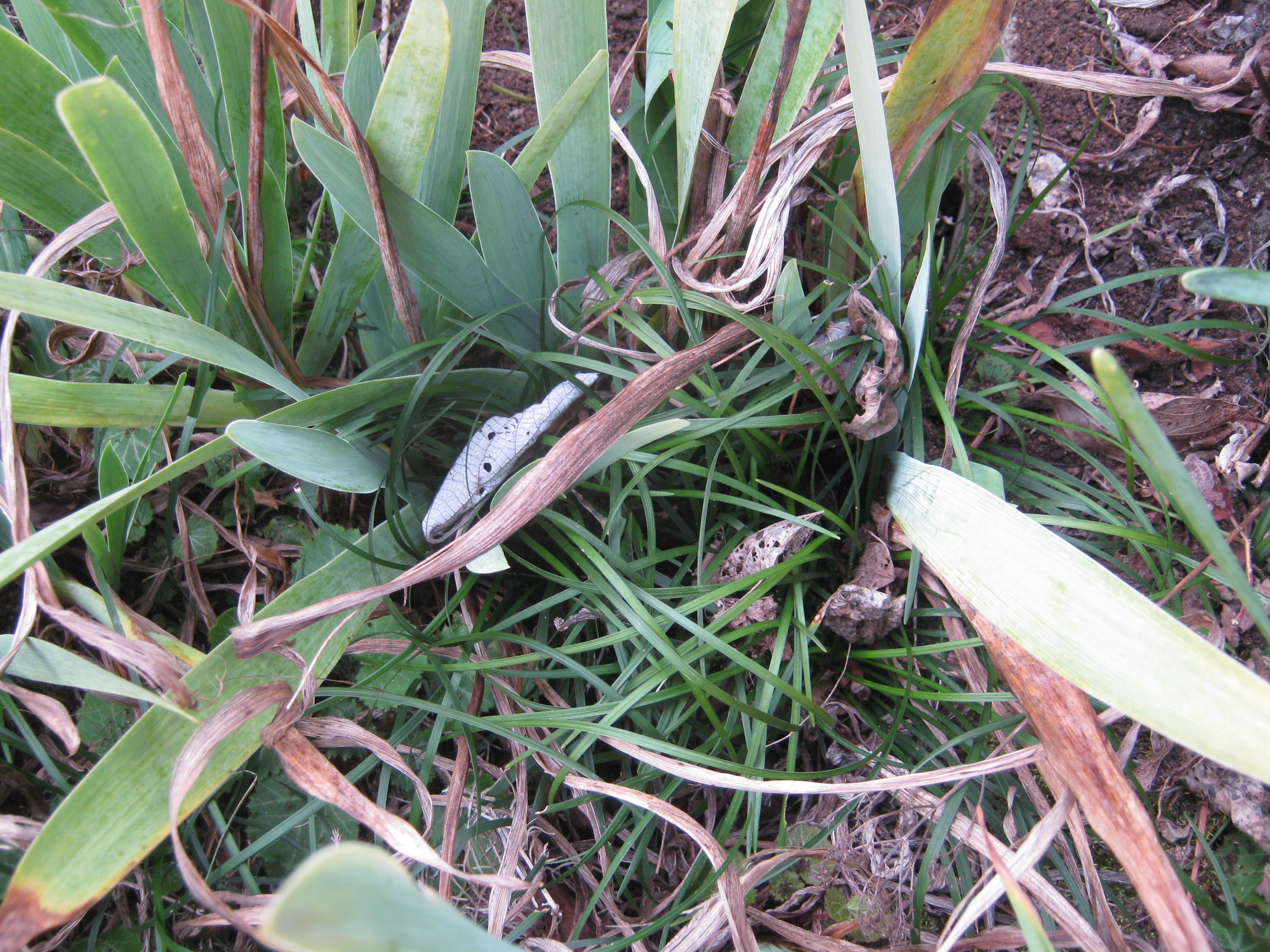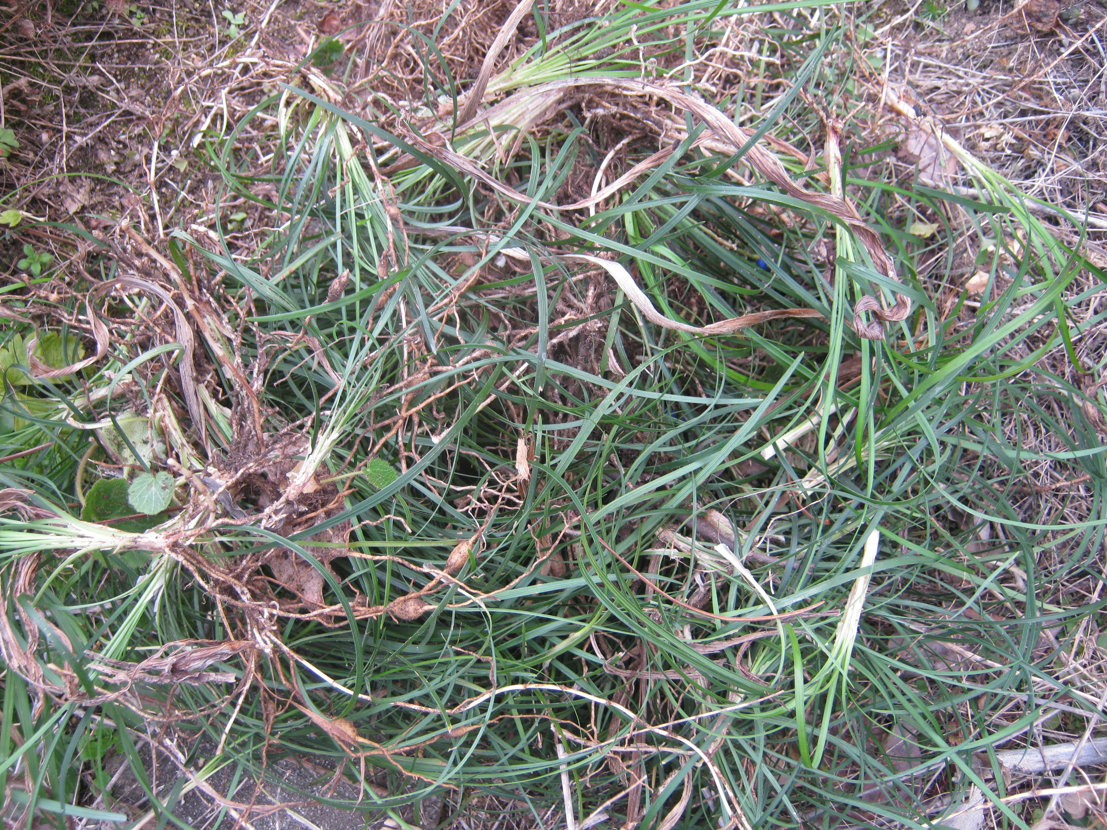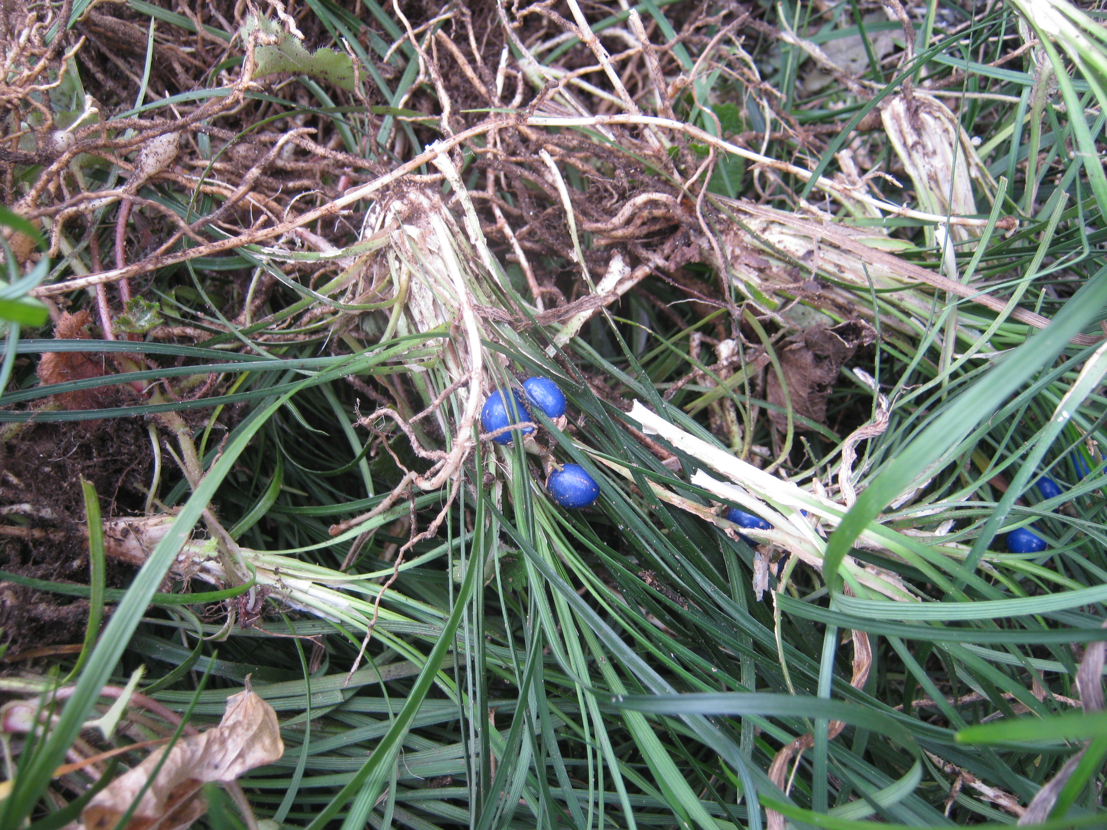 大根だけ引いて帰るつもりが、すぐそばのイチハツ(正しくは匂いイリス)の株の間にタマリュウが入り込んでいるのに気づきました。