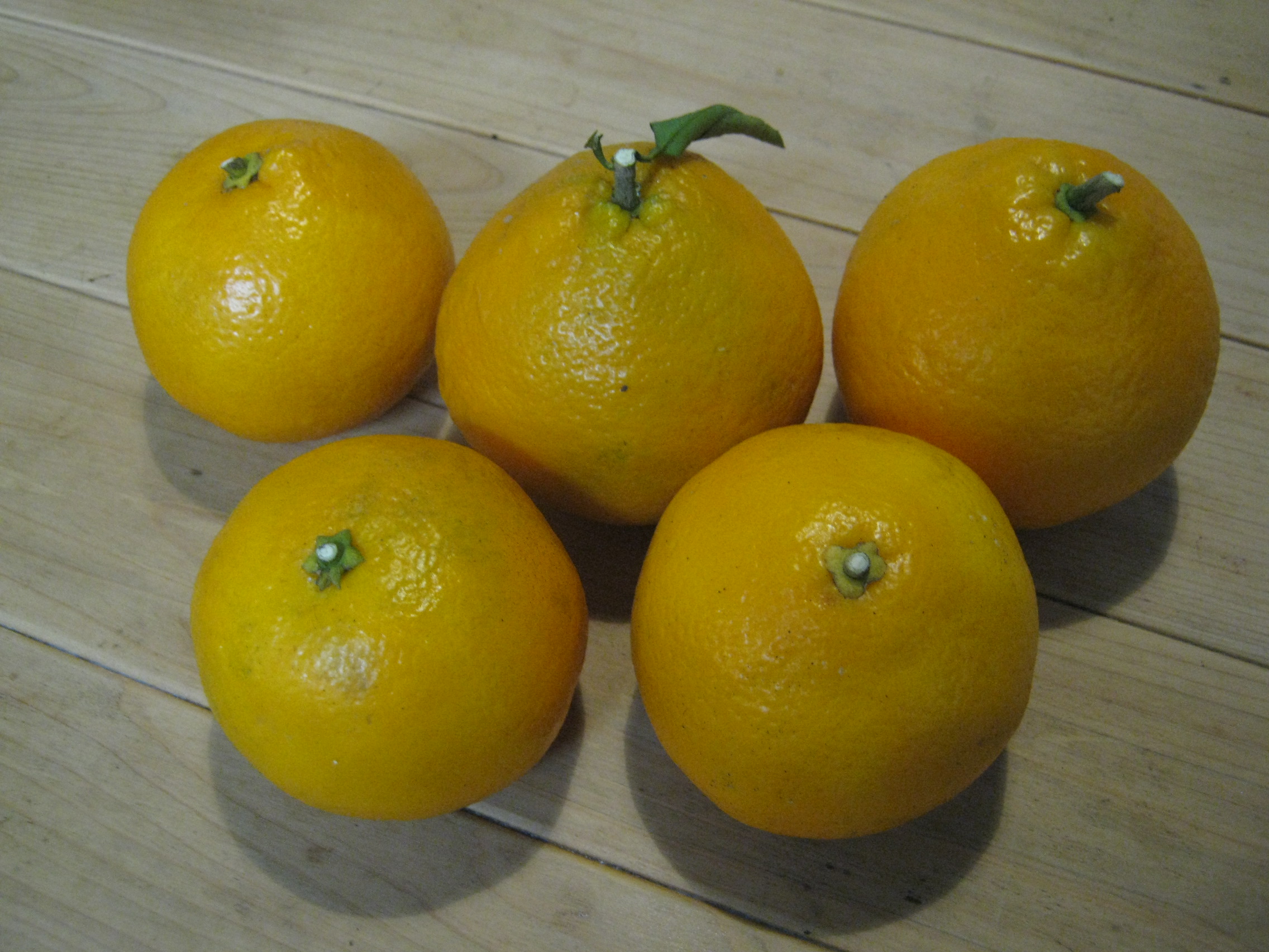 2026/01/18(日)自家栽培の伊予柑をもらいました 叔母から白菜をもらいましたが、伊予柑がついていました。 去年もらった時と同じくデコポンのようなでっぱりがあるものもあります。 今年は無いものも混じっています。 早速味見をしたいところですが、正月用に箱買いしたミカンがまだ残っています。 調べたら日持ちは常温で2週間。 もぎたてをもらったはずなのでもう少し先のお楽しみにしたいと思います。 鹿の餌になりそうなので、植えるのはあきらめました。