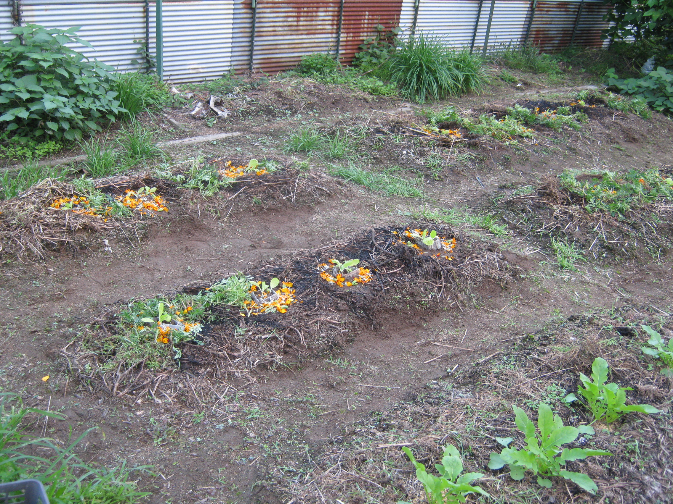 紙ポットごと植えるのに少し移植ゴテで掘ったら、ヨトウムシっぽいのと遭遇したので、マリーゴールドを散らしました。