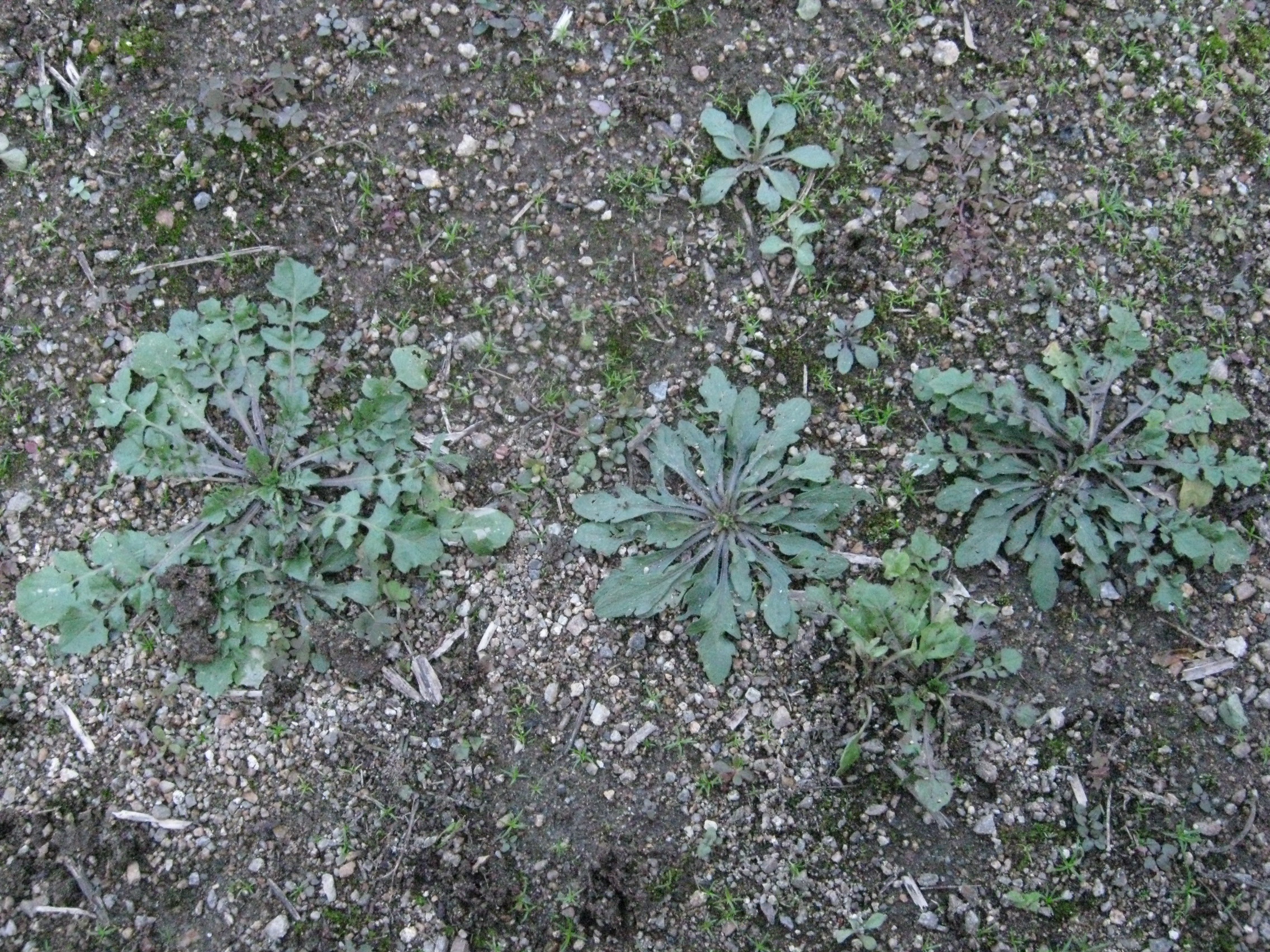 3っつ似たような色のロゼットが並んでいますが、両端がナズナ。