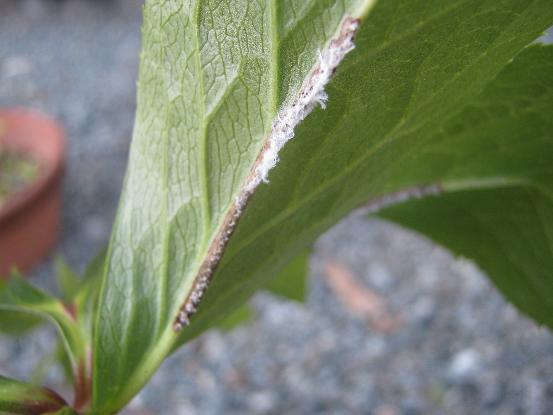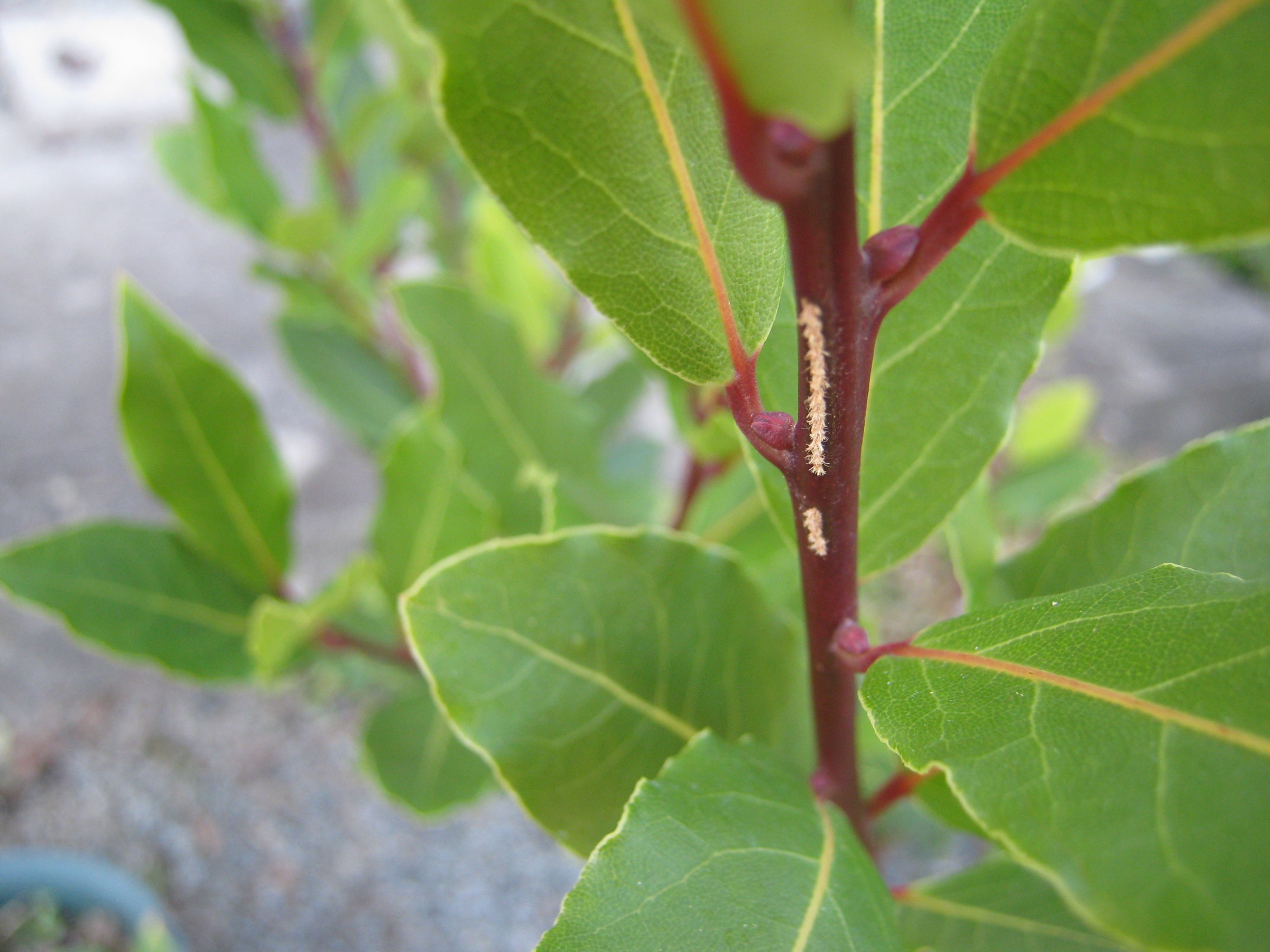 今日、カイガラムシのようなものがついていたクリスマスローズを久しぶりに確認したら、葉の裏にゲッケイジュの枝と同じようなものがついています。