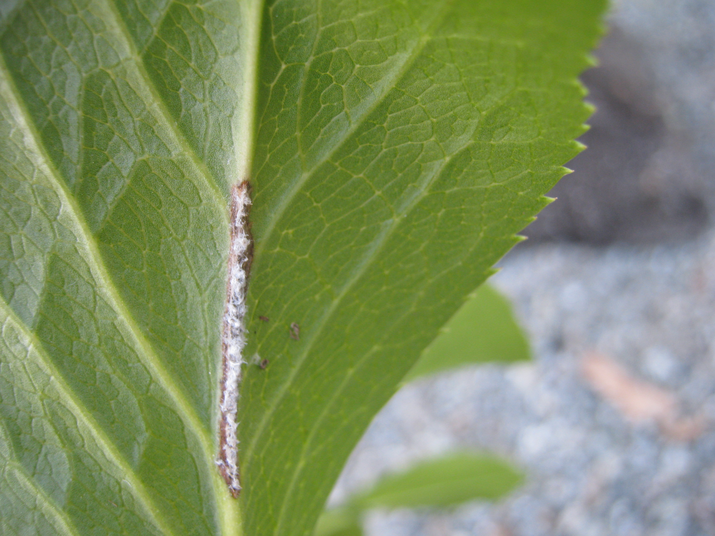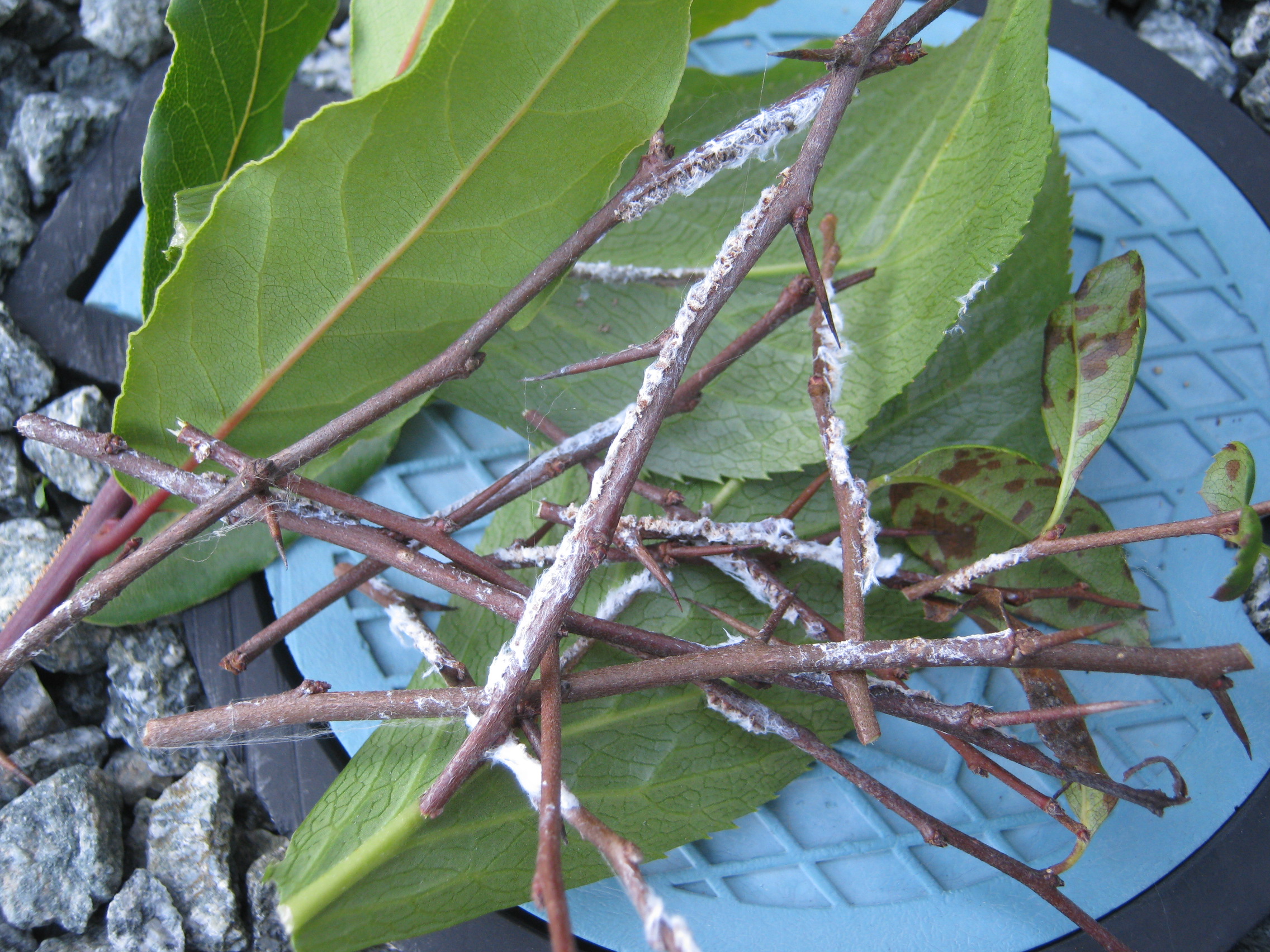 数日前、ゲッケイジュの枝にアオバハゴロモが連なっているのをみつけ、ティッシュペーパーで絡めとったらチュウレンジハバチの産卵跡のようなものが残りました。
