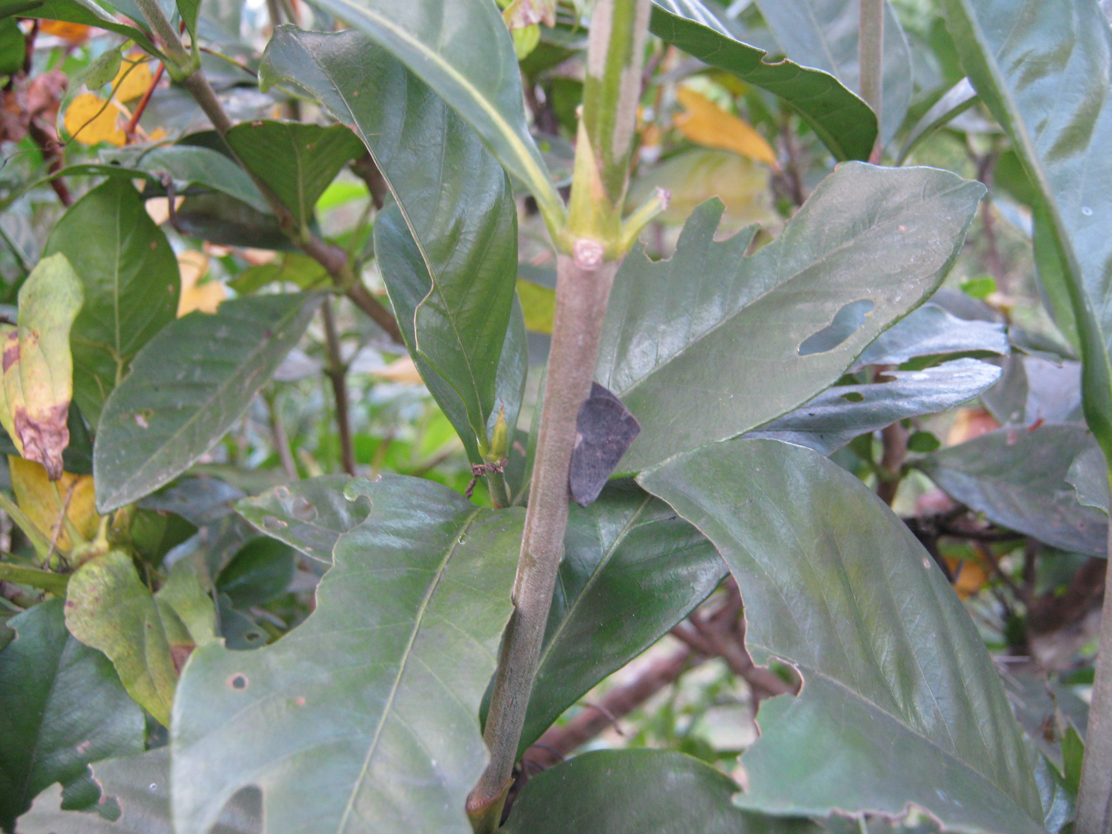 その後、昨日の続きでカリンを採りに畑に行くと、近くに生えているお茶やクチナシの枝に似たようなのがいっぱいついています。