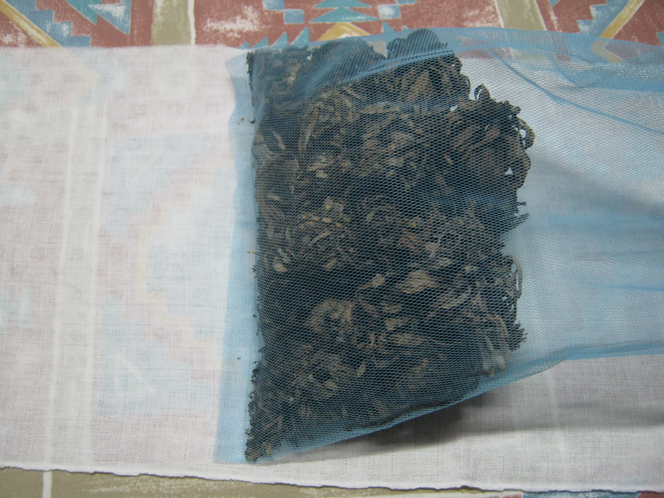 2025/12/10(水)種乾燥用の袋 花::ジニア 去年、もらったケイトウの花をタマネギが入っていた袋に入れて乾燥させたら網の目から飛ばされたと思われる場所から芽が出てきました。 今年はヒャクニチソウの種を水切りネットに入れて乾燥していましたが、まだ目が粗すぎるようです。 昨日乾燥中のピールのカバーを作る晒を探していたら見つかったガーゼの端切れ。 手作りマスクを作った時の端切れです。 ちょうど使えそうな幅で残っています。 ケイトウ用と合わせ2つ作成。 茶袋と同じように縫い代を外側にしました。 アイロン台のゴミを掃除しよとしたら、小さな動くものが…。 種に殺虫剤かけても大丈夫なんでしょうか(汗)