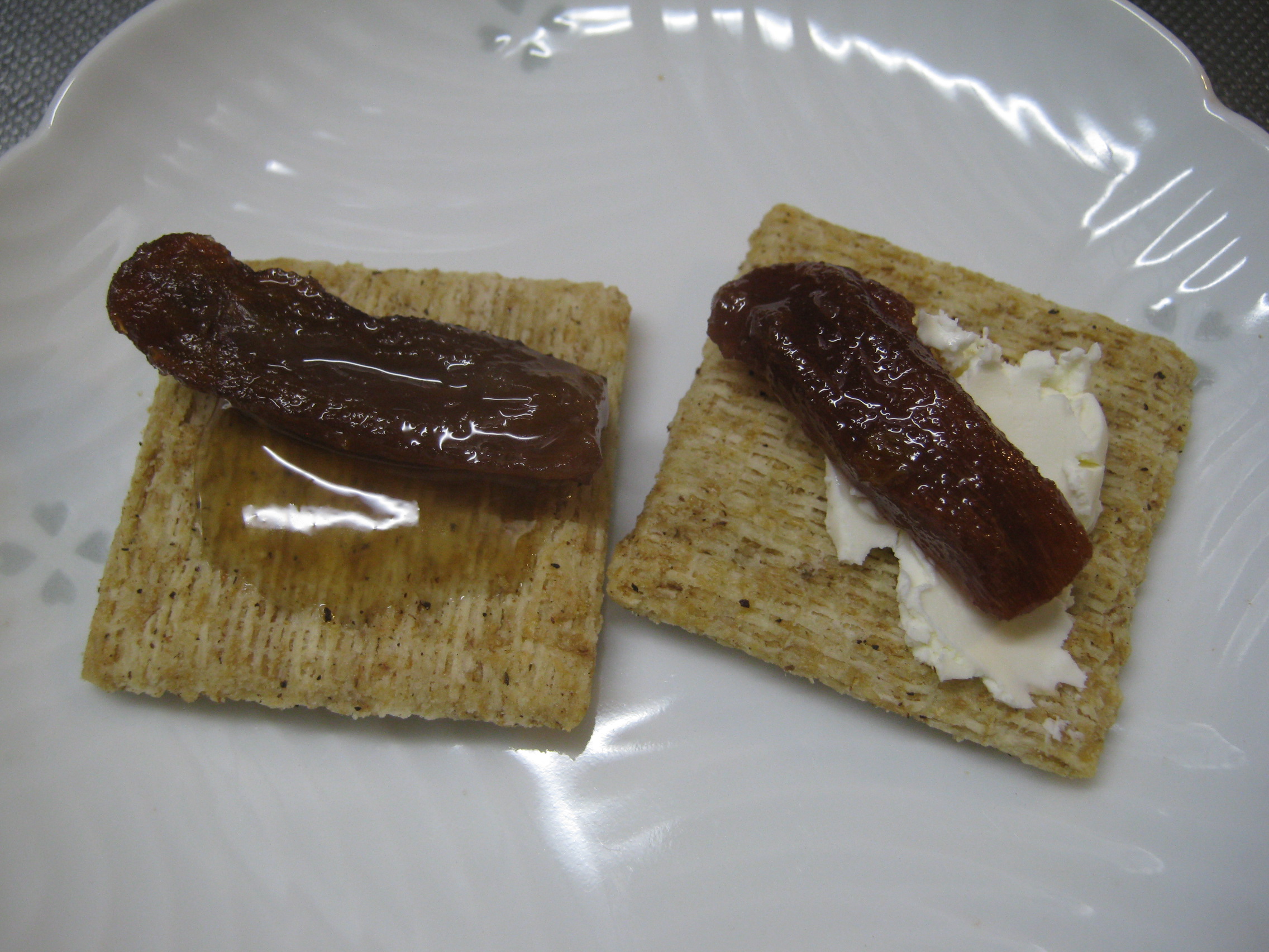 胡椒とオリーブのくせ強クラッカーに乗せたせいで、どちらが美味しいか分からず。