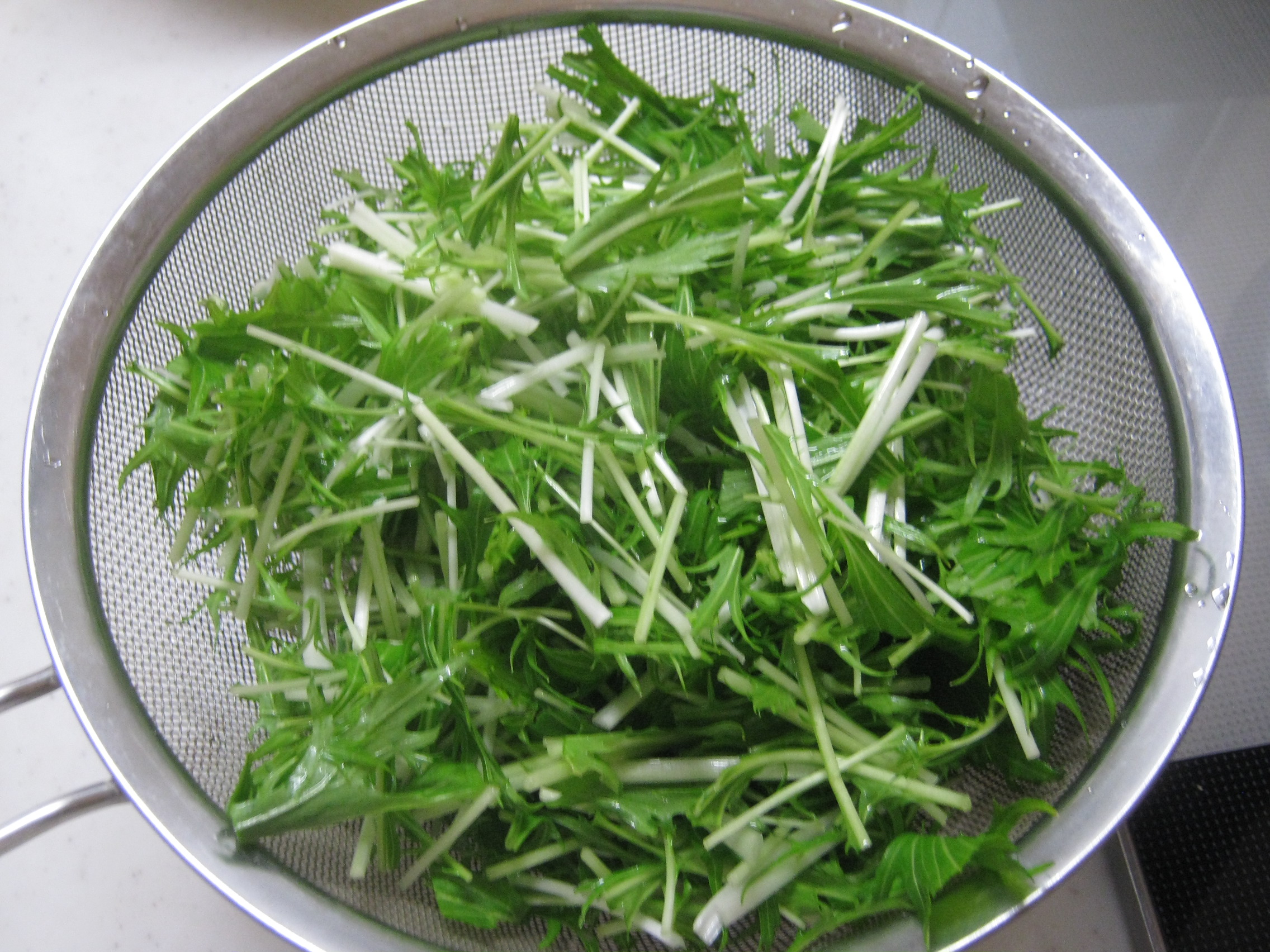 4cmほどにカットし、水にさらして土やゴミを落とし浮いている水菜をザルにつまみ上げ。