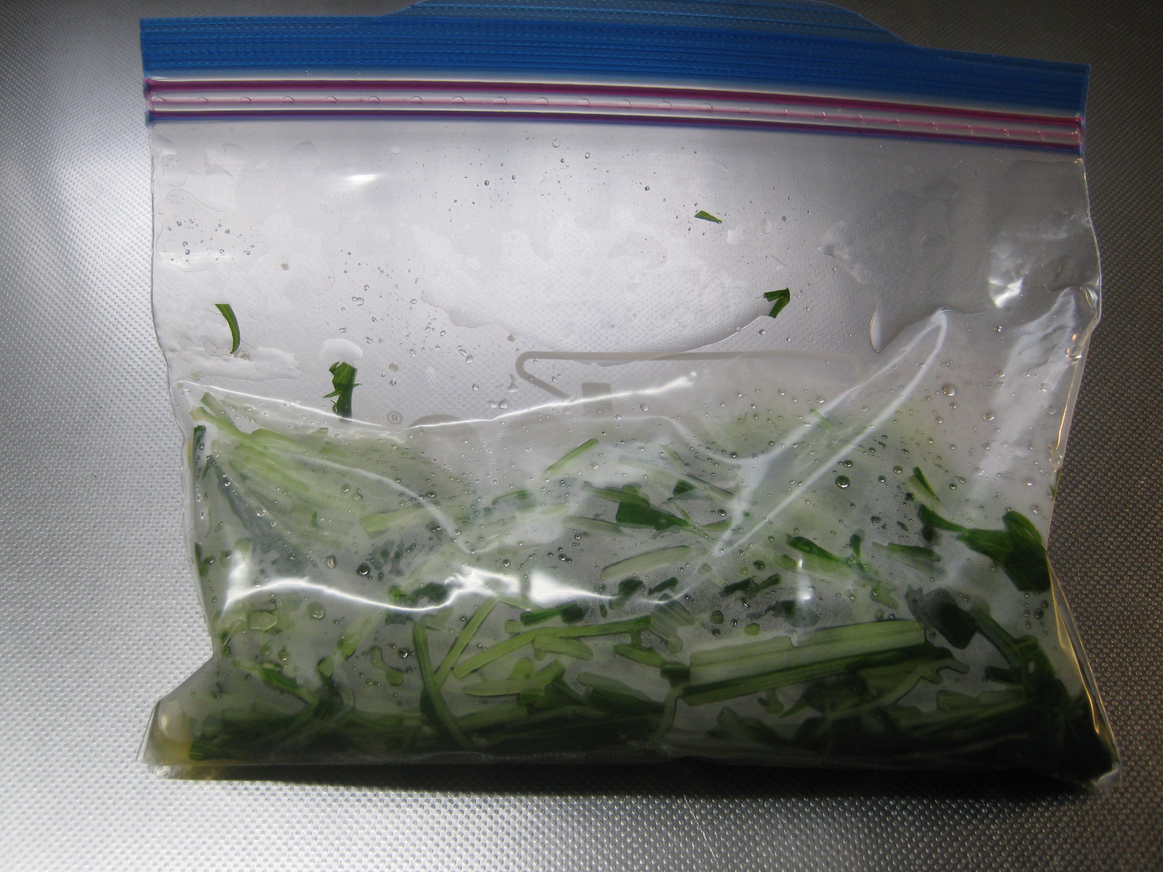ジップロックに入れる前に絞ればさらにかさが減りますが、絞らずに入れてます。