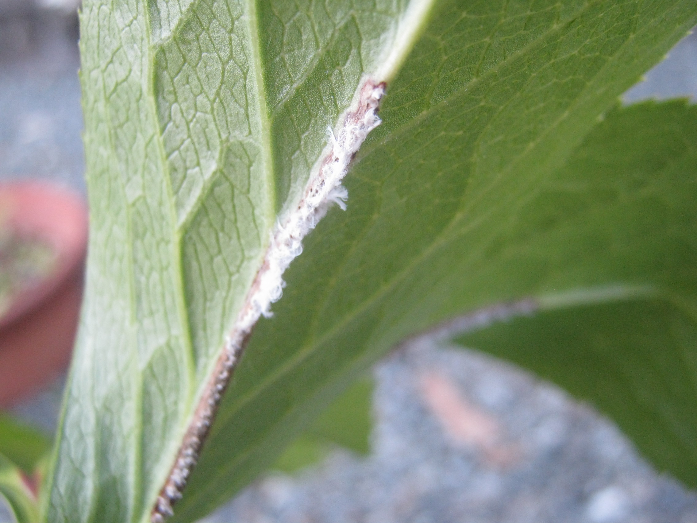 ハゴロモ科 2025/11/17 チュウゴクアミガサハゴロモ 初めて見ました(2025/11/15) 白い小さな紋が三角形に見えるので間違いない? クリスマスローズの葉の裏に産み付けられた卵(2025/11/15)
