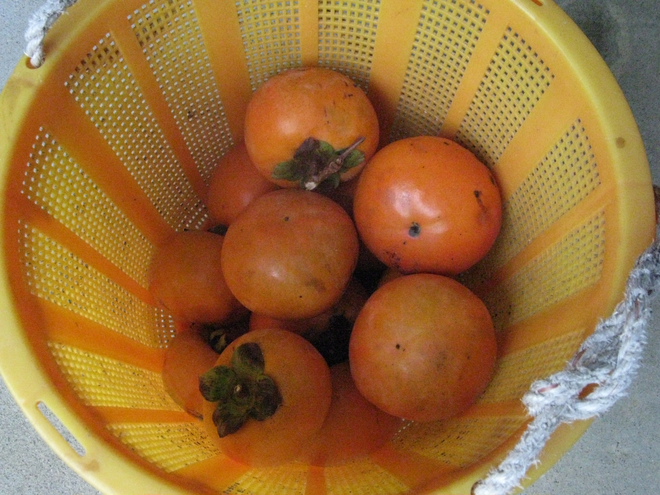 一本の木に甘柿と渋柿がなります。甘柿は果肉に黒い点々があります。渋柿は熟柿(じゅくし)にしたり、アルコール(焼酎)で渋抜きしたりします。